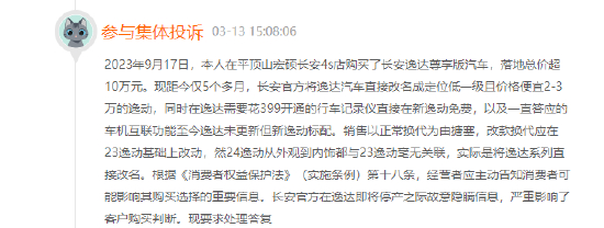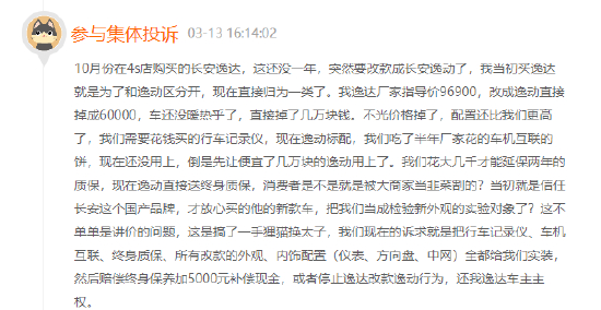 投诉内容主要集中在车名从逸达变成逸动、价格下调了2-3万等。