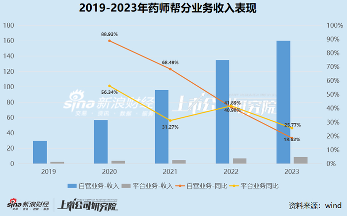 可以看出,不论是药师帮的平台业务还是自营业务,当下均面临着营收增速放缓。其中,2023年药师帮的自营业务营收增速降至18.62%,而去年同期为40.98%,平台业务营收增速降至25.77%,而去年同期为41.89%。