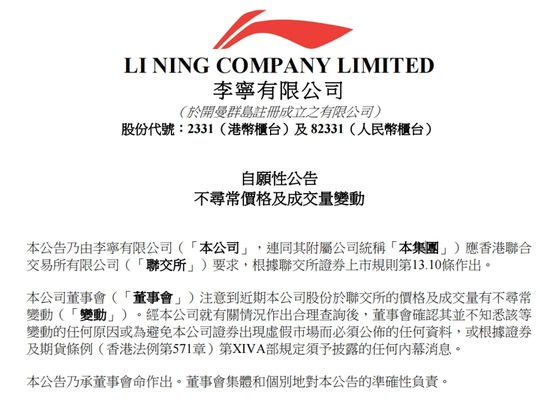 12日收盘后,李宁公司发布公告,表示对不寻常的价格变动原因并不知悉。该公告未正面回复私有化的传闻。次日开盘后,股价又有小幅回落。
