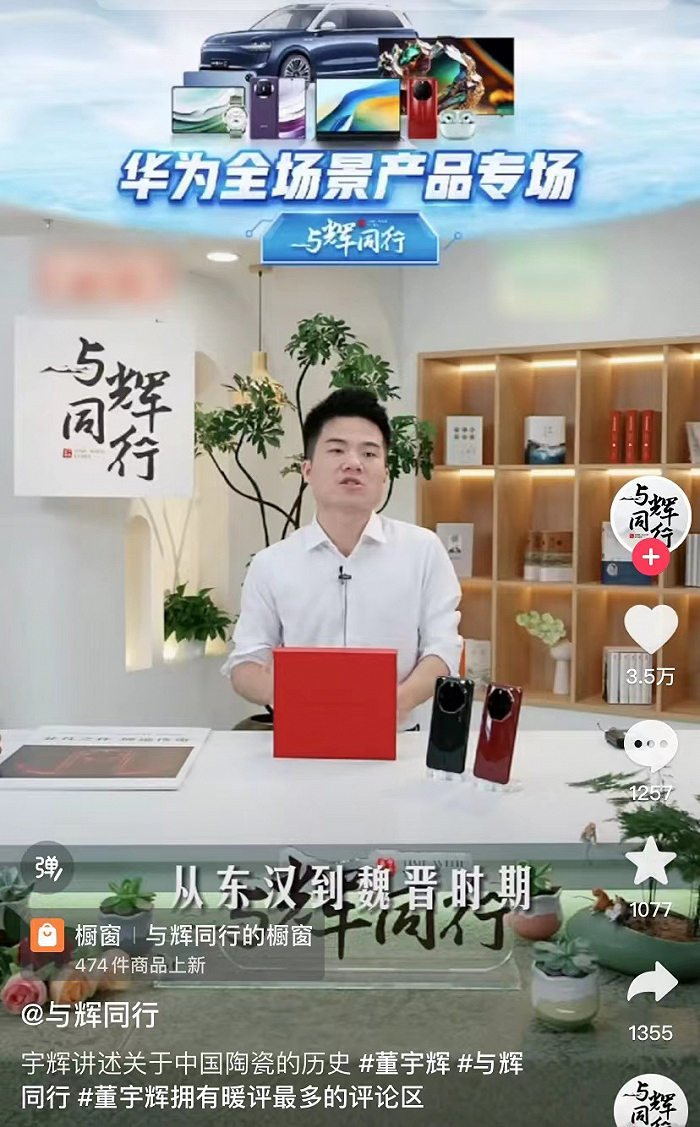 直播过程中,董宇辉还深度解读了华为Mate60 RS手机陶瓷后壳的制作工艺,及陶瓷的相关文化历史,“陶瓷在遇见你之前,已经走过了几千年”。