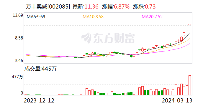 其中,万丰奥威在这波低空经济股市行情中涨势明显,2月6日万丰奥威股票涨停,报收5.17元,随后股价一路向上。截至3月13日收盘,万丰奥威报收11.36元,股价已经翻一番。