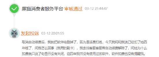 另有投诉者表示:取消自动续费后,我就把软件给删掉了,因为是话费扣钱,今天我妈和我说已经扣了她四年钱了,问我怎么回事(我用的副卡),我去找客服客服帮自动续费解除了,问她为什么扣费就只说了句显示没有关闭,这四年我并没有使用过改软件,软件扣费也没有提醒我。