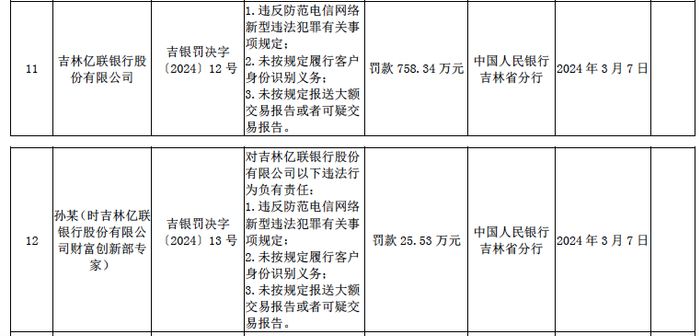具体而言,吉林亿联银行因违反防范电信网络新型违法犯罪有关事项规定、未按规定履行客户身份识别义务、未按规定报送大额交易报告或者可疑交易报告被罚758.34万元。