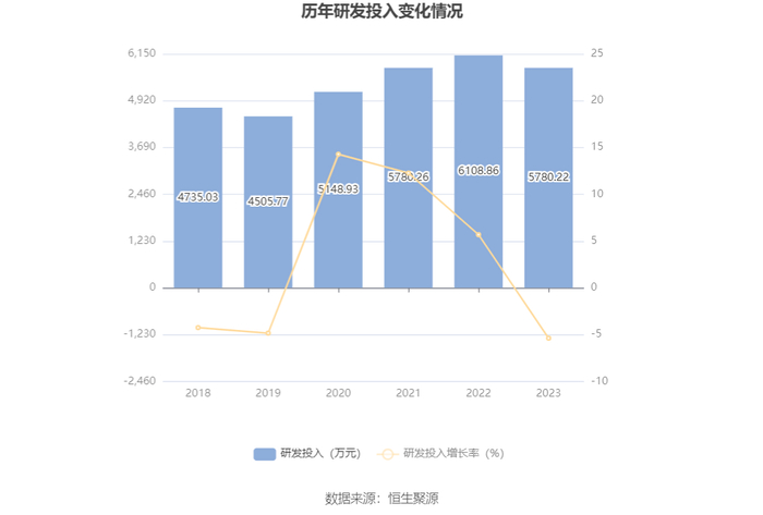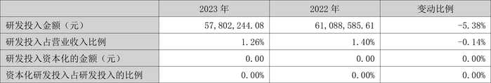 2023年全年,公司研发投入金额为5780.22万元,同比下降5.38%;研发投入占营业收入比例为1.26%,相比上年同期下降0.14个百分点。此外,公司全年研发投入资本化率为0。