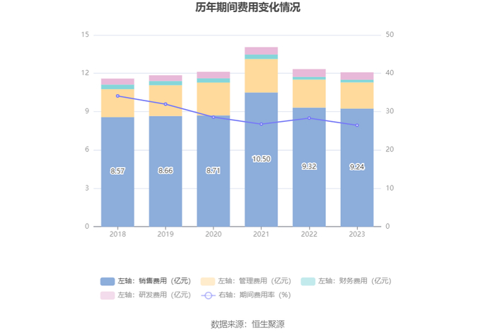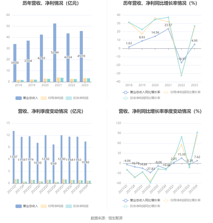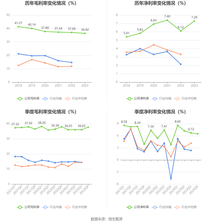 2023年,公司毛利率为36.42%,同比下降0.67个百分点;净利率为7.29%,较上年同期上升1.17个百分点。从单季度指标来看,2023年第四季度公司毛利率为37.74%,同比下降0.25个百分点,环比上升1.72个百分点;净利率为6.49%,较上年同期上升2.68个百分点,较上一季度下降0.23个百分点。