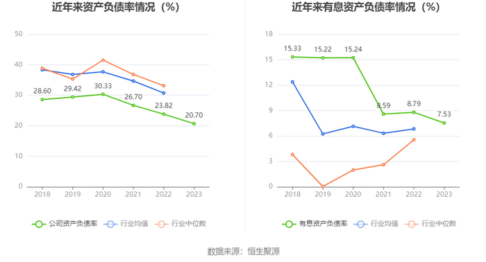 在偿债能力方面,公司2023年年末资产负债率为20.70%,相比上年末下降3.12个百分点;有息资产负债率为7.53%,相比上年末下降1.26个百分点。