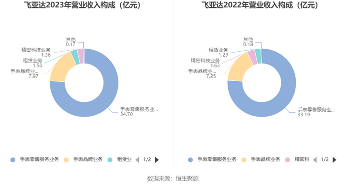 分产品来看,2023年公司主营业务中,手表零售服务业务收入34.70亿元,同比增长4.56%,占营业收入的75.94%;手表品牌业务收入7.97亿元,同比增长9.88%,占营业收入的17.44%;租赁业务收入1.50亿元,同比增长16.32%,占营业收入的3.29%。