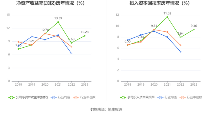 数据显示,2023年公司加权平均净资产收益率为10.28%,较上年同期增长1.60个百分点;公司2023年投入资本回报率为9.36%,较上年同期增长1.42个百分点。