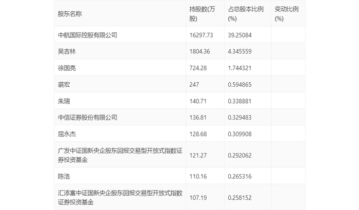 年报显示,2023年年末公司十大流通股东中,新进股东为中信证券股份有限公司、广发中证国新央企股东回报交易型开放式指数证券投资基金,取代了三季度末的融通动力先锋混合型证券投资基金、融通蓝筹成长证券投资基金。在具体持股比例上,中航国际控股有限公司、裘宏、朱瑞、屈永杰、陈浩持股有所上升,吴吉林、徐国亮、汇添富中证国新央企股东回报交易型开放式指数证券投资基金持股有所下降。