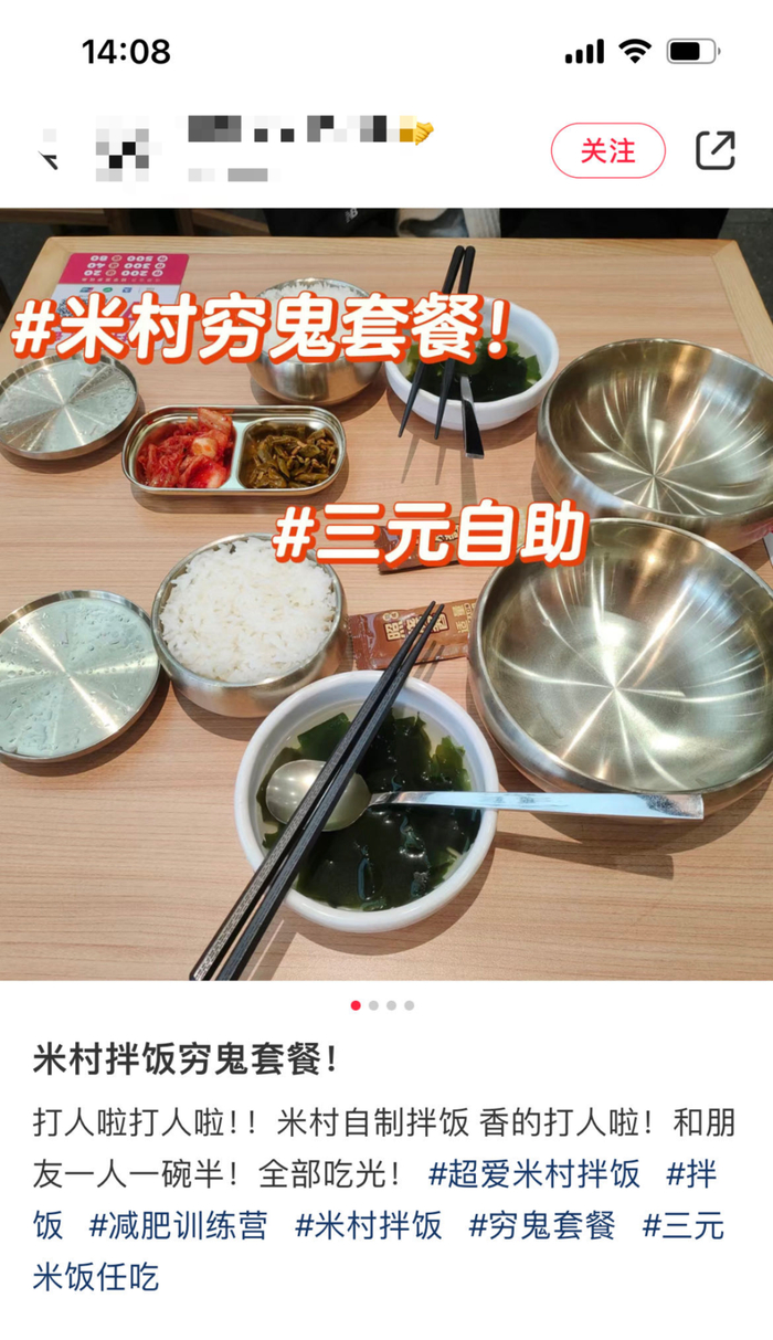 作为一家以韩式拌饭为主的餐饮品牌,米村拌饭本身就主打性价比,如9.9元的石锅拌饭、19.9元的鸡排拌饭等。其穷鬼套餐是网友开发出来的,指的是花3元要一份米饭,米饭可以无限续,就着免费的海带汤和辣白菜。3元吃一顿饭这在10年前几乎都做不到,而这个套餐也在小红书、微博上被大量讨论,为米村拌饭带去不少新客。