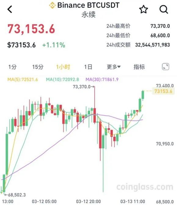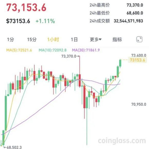 截至发稿,比特币价格在经历了短暂回调后,再次回到7.3万美元上方,现报73153.6美元,日内涨幅1.11%。数据显示,过去24小时,共有超10万人被爆仓,爆仓总金额为3.48亿美元。