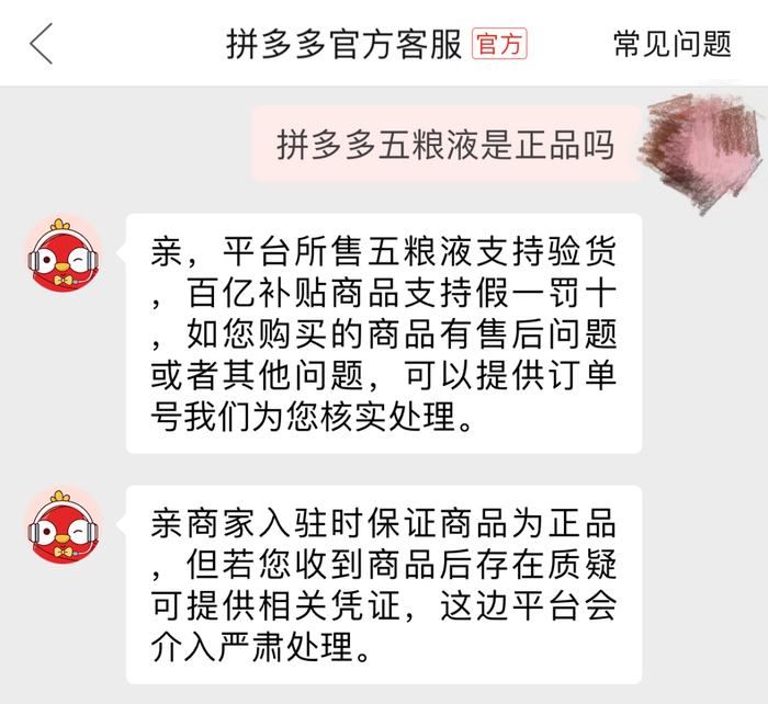 针对五粮液在声明中提及“多家(拼多多)店铺销售五粮液为假冒”一事,拼多多官方客服对记者表示,百亿补贴商品支持假一罚十,若消费者收到商品后存在质疑,可提供相关凭证,平台会介入严肃处理。