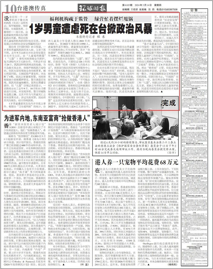 “谁才是虐童元凶”,《中国时报》13日刊登的一篇评论称,这起虐童致死案,应该被追究指责的不仅仅是犯案的保姆、访视监督不周的福利机构,真正掌管儿童保护工作的是台“行政院”。文章称,台湾儿童保护权责规定,不足两岁的幼儿照顾如托婴中心与保姆,是由“卫福部”管辖;2至6岁就读的幼儿园,则由“教育部”主管。但是各种政策涉及到很多层面,必须由“行政院”统一整合,才能克服跨部会互相推卸责任的困境。但到目前为止,“行政院”官员躲在一旁,放任舆论指责保姆、社工和“儿盟”,刻意让民众忽略当局的混乱无章,更缺乏专责机构的儿童保护政策,民进党当局轻忽的态度恐怕才是虐童案频发最大的元凶。