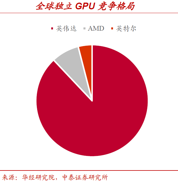 GPU市场马太效应显著,目前我国国产化率仍不足10%。由于中国芯片产业起步较晚,且高端芯片的技术突破不可通过简单累积实现,在高端芯片领域市占率较低。从全球范围来看,据华经产业研究院统计,在独立GPU竞争市场上,英伟达处于垄断地位,市占率高达88%,马太效应显著;从国内GPU市场上来看,尽管国内GPU市场广大,但目前国产化率不到10%亟待提升,国产AI芯片厂商空间广阔。