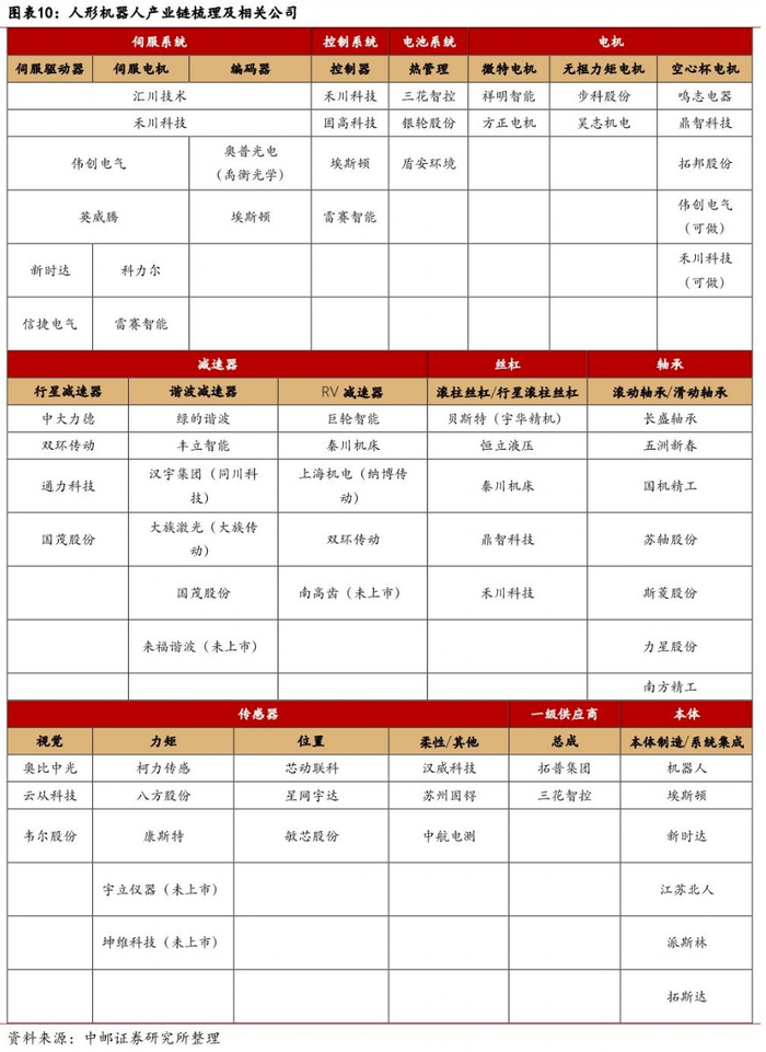 该机构梳理的人形机器人产业链涉及汇川技术、三花智控、鸣志电器、昊志机电等A股多家公司。