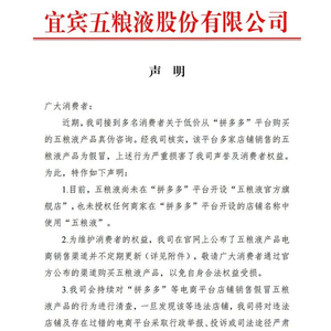 五粮液发声明:多家拼多多店铺销售商品为假!平台客服回应→