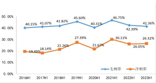 很明显,通策医疗的毛利率和净利率从2021年开始逐步下滑。根据2023年半年报披露,公司的毛利率由2021年上半年的46.75%下降至2023年上半年的41.36%;而净利率也从30.11%下降至26.32%。曾经的“牙茅”早已没了往日的春风得意。
