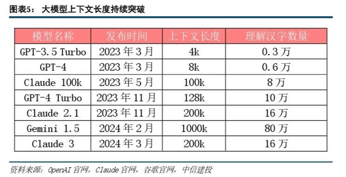 大模型上下文窗口长度持续突破。文本生成以token作为处理文本的单位,复杂汉字(如“夔”)可能会分解为若干token的组合,“中国”等短且常见的短语则可能使用单个token。通常而言,1个token相当于1.5-2个汉字;最大上下文长度,则指文本输入和输出合计使用的token数量上限。23年上半年发布的GPT-4、Claude-100k上下文长度分别为32k、100k,对应2.5万、8万汉字的上下文;23年下半年发布的GPT-4 Turbo将上下文长度增加至128k,预计对应10万汉字。而24年2月发布的Gemini 1.5,则实现破纪录的100万token上下文。据月之暗面,Kimi Chat在中文上具备显著优势,实际使用效果能够支持约 20 万汉字的上下文,显著多于GPT-4 Turbo。