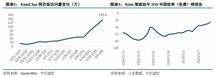 智能助手KimiChat具备长文本能力,近期访问量显著增加。KimiChat是国内创业公司月之暗面的首个C端产品,于23年11月正式向所有用户免费开放,能高效处理约20万汉字的上下文,完成智能搜索、高效阅读、整理资料、辅助创作等功能。该产品已先后推出网页版、小程序版和APP版本。据Similarweb,2月网页版访问量291万,环比翻倍;3/2-3/8周度访问量135万,环比+24%,屡创新高。据七麦数据,目前App版本排名IOS中国区效率(免费)榜20-30名,呈现上升趋势。