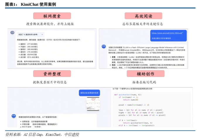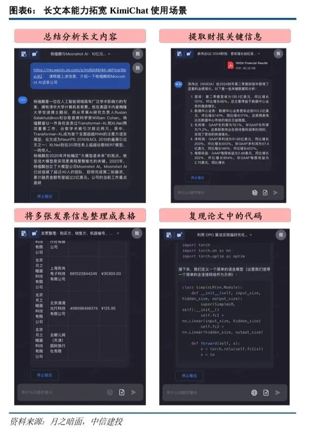 长文本能力增加,能显著拓宽大模型应用场景。以月之暗面为例,公司克服文本内容精准抓取、高算力需求、严重显存压力等困难,研发出首个支持20万字输入的千亿参数LLM产品KimiChat。在长文本能力加持下,该产品具备的能力包括:通过多篇财报进行市场分析、处理超长的法务合同、快速梳理多篇文章或多个网页的关键信息、基于长篇小说设定进行角色扮演。