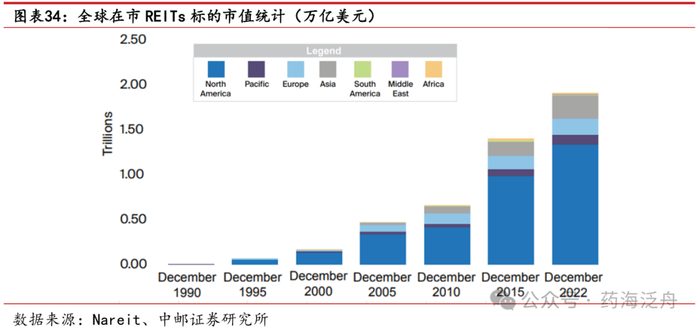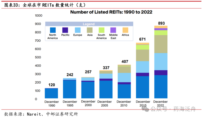 全球REITs资产管理规模约2万亿美元。近三十年来,公募REITs的数量和股票市值均大幅增长,截至2022年12月,全球共有893个上市REITs,总股本市值约为1.9万亿美元。