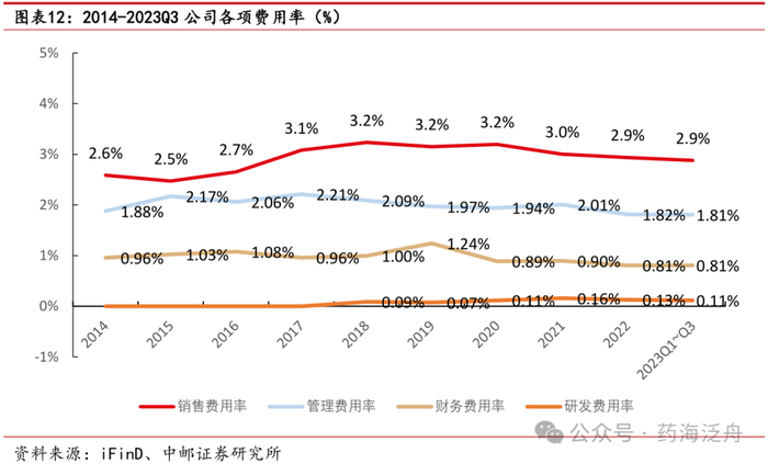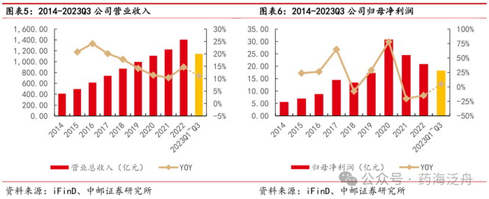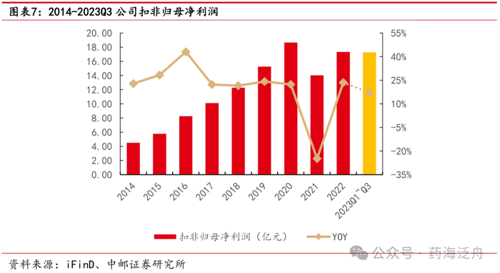 扣非归母净利润企稳回升,盈利能力逐步增强。2014-2022年公司扣非归母净利润由4.50亿元增长至17.34亿元,复合增长率CAGR约为18.37%。2021年公司实现扣非归母净利润14.03亿元,同比下降24.80%,主要归因于疫情品种销售减少,疫情补贴及政策优惠结束,研发投入加大等多方面原因。2022-2023年,公司实现扣非归母净利润快速增长,分别同比增长23.56%、17.09%,公司在保证营业收入稳步增长的同时,盈利能力也在持续提升。