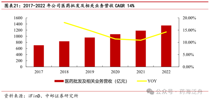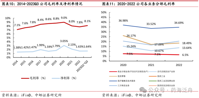 从利润端来看,2014-2022年公司归母净利润由5.61亿元增长至20.85亿元,CAGR为17.8%。其中,2021年公司归母净利润由30.75亿元下降至24.48亿元,同比下降20.39%;主要归因于公司个别总代理疫情品种销售减少,出口防疫物资销售降幅较大,疫情补贴及政策优惠结束,公司在数字化转型、创新业务和创新模式上加大投入,多地洪涝灾害影响以及产品销售受严格管控等多方面原因。2022年公司归母净利润为20.85亿元,同比下降14.84%,主要归因于2021年公司持有的爱美客技术发展股份有限公司(简称“爱美客”)股票价格变动引起公允价值变动形成非经常性损益10.45亿元,而2022年报告期非经常性损益有所下降,仅为3.51亿元。2023年Q1~Q3,公司实现归母净利润18.24亿元,同比增长4.89%,公司医药分销业务稳健增长,总代品牌推广、医药新零售、数字物流技术与供应链解决方案、医疗健康及技术服务等新兴业务加速增长,助力公司上半年经营业绩企稳回升,归母净利润企稳修复趋势显著。