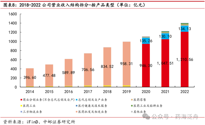 商业分销为核心营收分部,总代总销及自产有望贡献新增量。2020-2022年,公司商业分销业务(不含总代总销及自产)分别实现总营收946.30亿元、1047.51亿元及1210.56亿元,突破千亿元营收大关,且分部营收占总营收占比稳居85%以上,是九州通的核心营收来源。此外,2020-2022年总代总销及资产业务营收均超130亿元,已成为公司第二大收入来源分部。