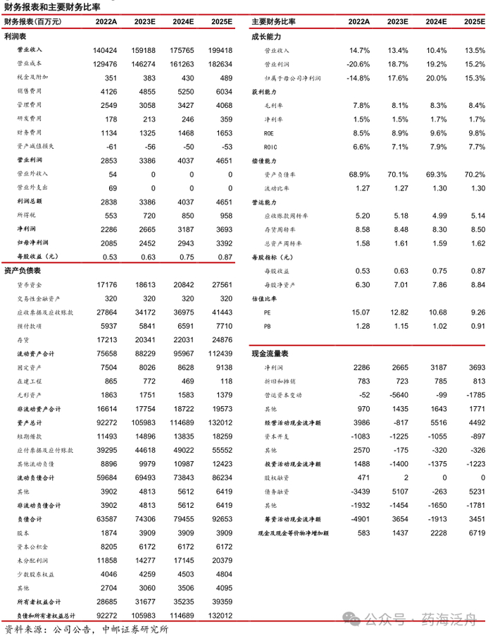 公司各项费用率稳中有降。从费用端来看,九州通各项费用绝对比率相对较低,费用率控制较好。销售费用率自2020年有所下降,减少至2.9%左右并维持稳定;管理费用率及财务费用率自2021年起出现回落趋势,分别下降至1.81%与0.81%的费用率水平;我们认为这主要得益于公司器械、总代、中药等高毛利战略产品销售占比不断提升,“Bb/BC仓配一体化”、多仓联网、九州万店数字化平台、ERP系统升级等PMO及数字化转型重点项目的深化推进,加速了公司经营模式的转型升级。公司研发费用率2019-2022年整体呈上升趋势,保持约0.1%的研发投入水平,归因于公司在数字化转型、创新业务和创新模式上的加大投入。
