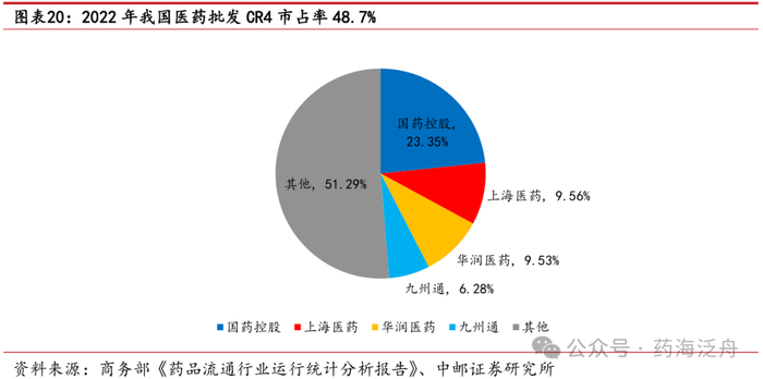 我国流通企业已形成“国有3+民营1”格局,CR4市占率47.7%,九州通市占率达6.28%。整体来看,我国医药流通市场“3+1”格局成型,头部流通企业市场份额不断提升。2022年我国医药流通行业CR4(国药集团、上海医药、华润医药以及九州通)市占率由2019年的40%提升至48.7%,我国医药流通市场“国有3+民营1”格局已然形成。九州通作为民营流通龙头企业,市占率由2019年5.1%提升至2022年6.28%,2017-2022年医药批发及相关业务营收CAGR为14%,领先行业6.10%的增速,整体增长稳健。