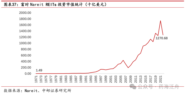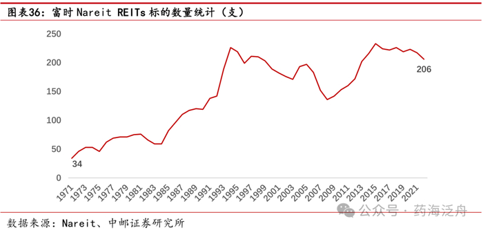 美国REITs发展相对成熟,中国REITs方兴未艾。美国公募REITs发展经历了三个阶段:(1)20世纪80年代前的萌芽起始阶段,该阶段地产行业REITs开始出现并确立法律地位;(2)20世纪80年代至20世纪90年代初的拓展机遇阶,该阶段美国地产行业迎来了多轮税收优惠的利好,底层资产多元化带动权益型REITs发展;(3)20世纪90年代至今的快速发展阶段,该阶段REITs涉及领域从地产向基建、仓储等多元行业延伸,养老金等多元化投资者的介入、伞形结构的发展,都为REITs提供了新的发展机遇。根据Nareit统计,美国富时Nareit REITs标的数量及市值快速增长,截至2022年美国REITs标的数量达206支,总投资市值达1.27万亿美元。