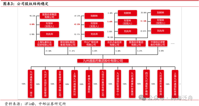 公司股权结构稳定。九州通公司的创始人为刘宝林、刘树林、刘兆年三兄弟,其中刘宝林先生为公司实控人,其通过直接与间接持股的方式持有公司股权约20.32%。从直接持股的大股东来看,上海弘康实业投资投资有限公司持股占比21.58%,狮龙国际(香港)有限公司持股占比11.41%,中山广银投资有限公司持股占比6.65%,为公司第三大股东;公司前三大直接持股股东合计持股占比约39.64%,持股占比较高。