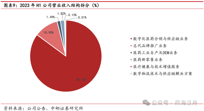 大力发展医药工业自产及OEM业务,提升新老产品竞争力。医药工业自产及OEM业务是公司重要的高毛利业务板块,该业务是公司在现已形成的品种、品牌、渠道与营销优势基础上,运用公司“千亿级”供应链服务平台所积累的大数据,有针对性开发自营工业产品与OEM业务,再通过公司全渠道的销售网络分销至终端或C端消费者。2023年前三季度,公司积极开发西药工业、中药工业自产及OEM业务,自有品类不断丰富,实现销售收入达17.66亿元,毛利率为23.38%,毛利额为4.13亿元。