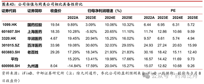 我们选取了同为医药商业赛道的国药控股、上海医药、华润医药、百洋医药、老百姓作为对比公司,公司估值具备性价比。公司转型成效逐步显现,数字化赋能下提升业务天花板,REITs项目启动开启新的战略转型,首次覆盖,给予“买入”评级。