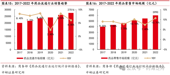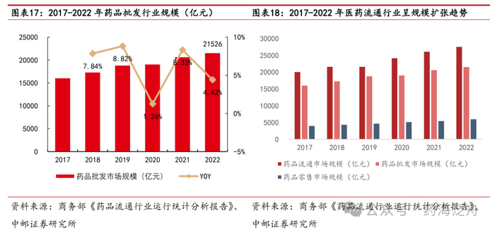 我国医药流通行业快速增长,行业集中度持续提升。根据商务部《药品流通行业运行统计分析报告》数据,2017~2022年我国七大类医药商品销售总额逐年增长,由2017年的20016亿元增长至2022年的27516亿元,CAGR为6.57%。细分市场来看,药品批发为我国医药商品销售额的主要来源,药品批发市场规模由2017年的16013亿元增长至2022年的21516亿元, CAGR为6.10%。从批发企业数量来看,2020~2022年我国批发企业数量分别为1.31万家、1.34万家、1.39万家,药品零售连锁企业数量分别为6298、6596、6650家,零售单体药店分别为24.1万家、25.23万家、26.33万家,医药流通行业企业及药店数量仍在增加,行业整合大势所趋。