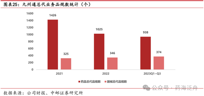 器械总代业务聚焦国内外品牌厂家,重点发展关键业务领域。截至2023年Q3,公司医疗器械总代品牌推广业务实现销售收入54.86亿元,同比增长19.05%;毛利额为2.69亿元,同比增长36.76%;已代理强生、理诺珐、雅培、费森尤斯(血透)等品牌厂家的品规共计374个。九州通聚焦国内外品牌厂家,重点发展大外科、心脑血管介入、IVD全国性平台等业务,强化供应链基本服务能力的建设,建立统一数字化平台,优化物流体系,完善专业人才,并探索推进全链路供应能力建设、耗材集中配送、检验科打包解决方案等。