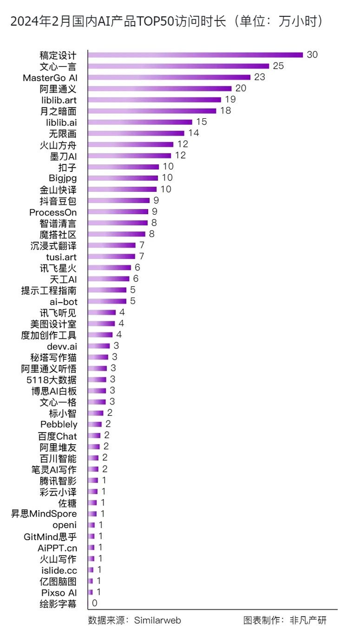 在2月国内Top50AI产品的月度访问时长中,个人聊天与助手类别的产品表现尤为突出,占据了访问时长排行榜的前列。其中,文心一言以25万小时的访问时长位居榜首,显示出用户对于智能聊天伴侣的高需求和活跃使用。紧随其后的是阿里通义和月之暗面,分别以20万和18万小时的访问时长,体现了国内AI聊天机器人的强劲竞争力。在图像与设计领域,稿定设计以30万小时的访问时长遥遥领先,反映出用户对于高效设计工具的迫切需求。墨刀AI和MasterGoAI也表现出色,分别以12万和23万小时的访问时长,显示出设计工具在个人和专业用户中的普及。值得注意的是,基础设施类别的产品如火山方舟和liblib.art,虽然访问时长不及个人聊天与助手和图像设计工具,但其12万和19万小时的数据也不容忽视,这表明了AI基础设施在企业级市场中的重要性和增长潜力。此外,翻译工具如金山快译和沉浸式翻译,以及智慧搜索工具如天工AI和devv.ai,虽然访问时长相对较低,但它们在特定用户群体中仍具有稳定的使用基础,体现了AI技术在特定领域的深耕细作。总体来看,2024年2月的数据显示,AI产品在个人聊天、图像设计和基础设施等领域的应用已经深入人心,而特定功能的工具如翻译和搜索也在其专业领域内发挥着不可或缺的作用。随着AI技术的不断进步和应用场景的拓展,预计未来这些产品将继续保持增长势头,为用户提供更加丰富和便捷的智能服务。