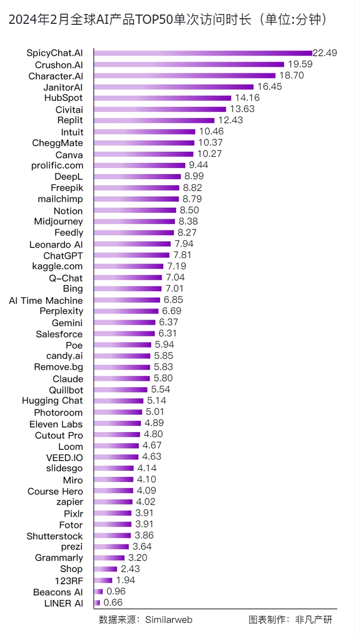 单次访问时长作为一个关键指标,揭示了用户在不同平台上的参与程度和兴趣深度。SpicyChat.AI和Crushon.AI作为聊天机器人类别的产品,其单次访问时长分别为22.49分钟和19.59分钟,显示出用户在这些平台上的高参与度。这两个产品的高单次访问时长也可能与它们的用户群体有关。例如,年轻用户可能更倾向于使用这些平台来探索新的社交方式,或者在寻找一种与传统社交不同的互动体验。此外,这些聊天机器人可能在特定时间段内提供了独特的价值,如在用户感到孤独或需要陪伴时。从数据中可以看出,Character.AI以18.7分钟的单次访问时长位居第三,这表明用户在使用情感陪伴类AI时,倾向于进行更长时间的互动,可能在寻求更深层次的交流和陪伴。紧随其后的是Notion,其单次访问时长为8.5分钟,这反映了用户在使用办公工具时的专注和投入,可能与处理复杂任务或进行深度工作有关。Q-Chat的7.04分钟时长也显示了教育工具在用户学习过程中的重要性,用户可能在这些平台上花费较多时间来巩固知识和完成学习任务。此外,Bing的7.01分钟和ChatGPT的7.81分钟表明,尽管这些平台的访问量有所波动,但用户在这些平台上的停留时间仍然较长,这可能意味着用户在搜索信息或进行个人聊天时,更倾向于深入探索和交流。值得注意的是,Canva的10.27分钟和Remove.bg的5.83分钟,以及LINERAI的0.66分钟,这些数据表明用户在使用设计工具和图片编辑工具时,可能会根据任务的复杂性调整他们的使用时长。而LINERAI的较短访问时长可能反映了用户在使用智慧搜索工具时的快速查询行为。