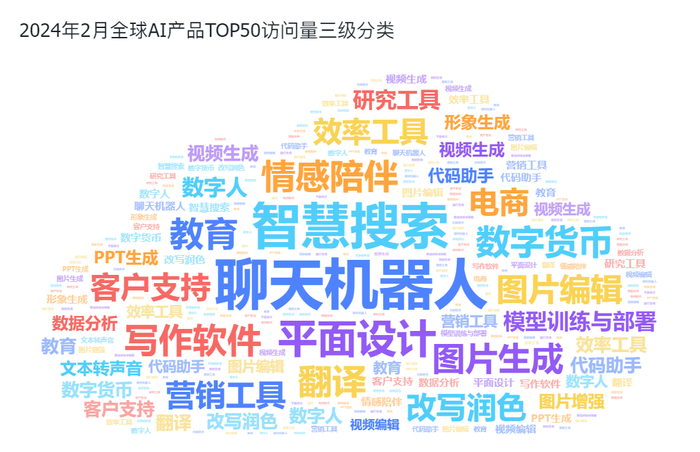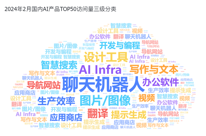 国内AI产品访问量TOP50中所涉及到了14个应用类别。其中聊天机器人、图片/图像、写作语文本以及AIInfra和办公软件,在2月成为最常被用户使用的应用。