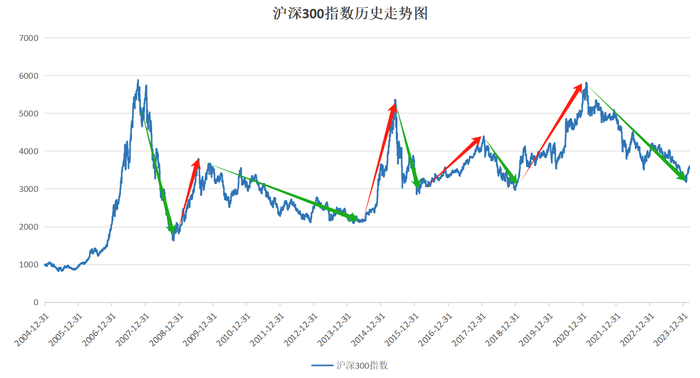 观察数据不难发现,指数的年度表现存在着一些牛熊交错、红绿互现的规律性。翻译成大白话就是,涨几年,跌几年,再涨几年,循环往复。