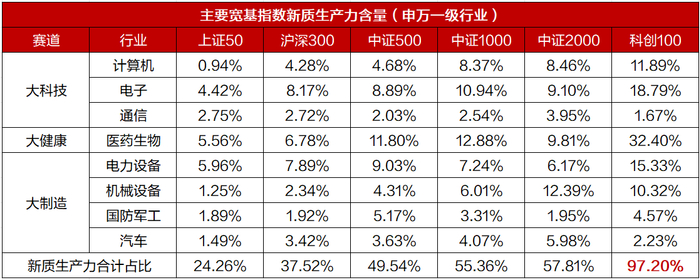 Wind数据显示,科创100指数中符合大科技、大健康与大制造的行业累计权重为97.2%,显著高于主流宽基指数。