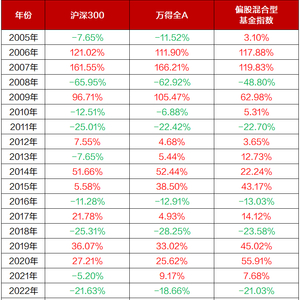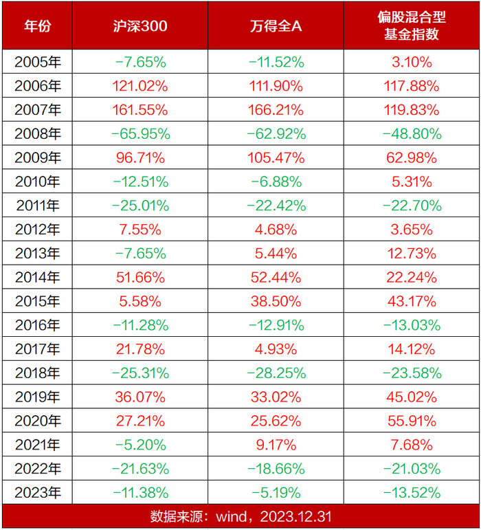 下面这张图是三个主要的行情指数沪深300、万得全A和偏股混合型基金指数自2005年以来的年度表现。