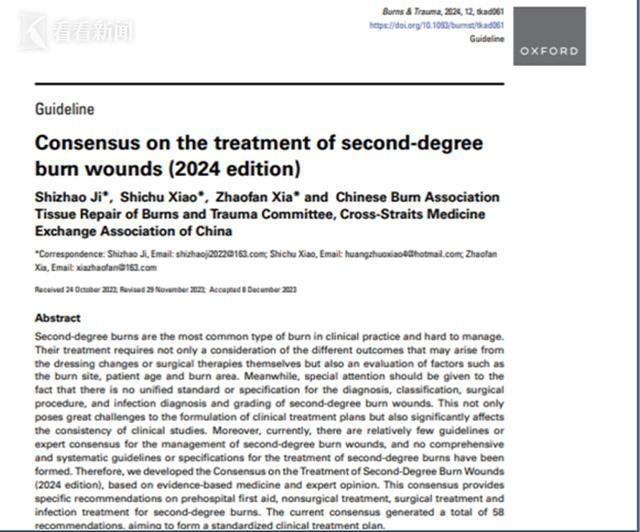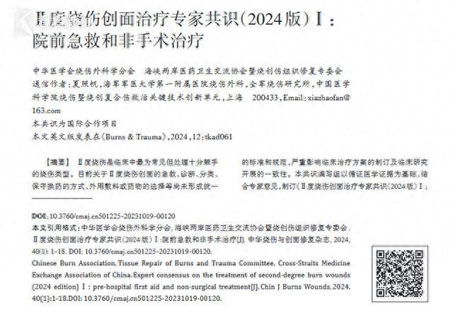 近日,由海军军医大学第一附属医院烧伤科夏照帆院士团队牵头制定的《Ⅱ度烧伤创面治疗专家共识(2024版)》正式刊登出版,这是国际首部针对Ⅱ度烧伤创面治疗的临床专家共识,以其权威性和前瞻性荣登国内和国际两本烧伤领域权威杂志—《中华烧伤与创面修复杂志》与《Burns&Trauma》。该部共识的发布将极大促进Ⅱ度烧伤创面诊疗方案的规范化,并为临床形成标准的诊疗路径提供重要指导和参考,同时,将进一步提升我国烧伤在国际的引领力和影响力。