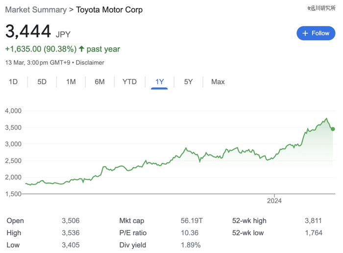 在无数投资人用真金白银投票的二级市场,曾经代表未来的纯电动车也失去了想象力。过去一年,特斯拉股价几乎原地踏步,而电动化转型最为保守的丰田,股价则暴涨了80%。