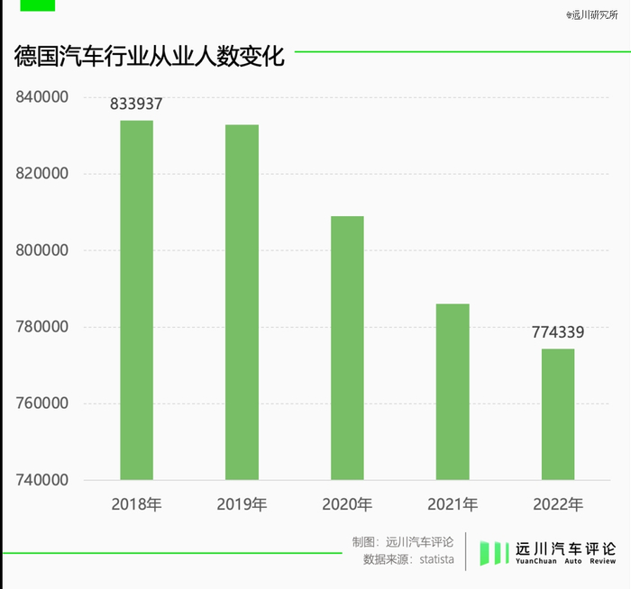 在转型相对积极的德国,过去五年汽车行业从业人数下降了6%[17],德国汉诺威应用科学大学汽车经济学讲师弗兰克·施霍普认为,德国汽车零部件供应行业会在2030年左右裁掉1/4左右的岗位。