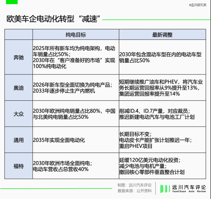 今年2月底,奔驰决定放缓电动化的转型进度,将2030年全面纯电的目标回调至50%电动化;更早些时间,奥迪决定将重点放在更多燃油车和插混车型上,以提升长期运营回报率[4];在欧洲之外,通用、福特等美国车企也推迟或者减少了对电动化的投入。