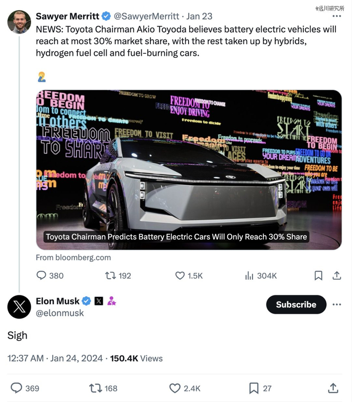 就在丰田章男发表“纯电三成论”不久,马斯克在社交媒体上转发了相关的报道。只不过这次,马斯克罕见地没有对反纯电言论犀利反击,只是回复了一声“sigh(叹气)”。