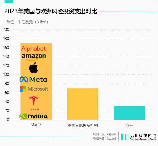 AGI喷涌的2023年,美国风险投资支出的主力是以Magnificent 7为代表的科技公司,其规模是美国其他投资机构的两倍、更是欧洲的近六倍[6]。欧洲并不缺钱,但从Mistral的融资就能看出,Old Money们更愿意扮演锦上添花的角色。
