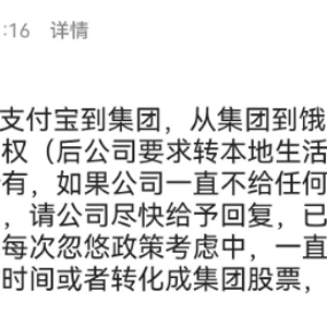 “对于期权的回购,我们希望公司能够当面沟通,并建立固定的沟通机制。但公司至今未回应。为此,我们计划在3月15日当天在阿里杭州西溪园区现场维权。”