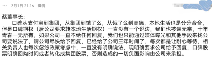 “在口碑并入本地生活后,当时选择离职的员工,阿里对其回购了股份。而留下的员工的口碑股份全部转成本地生活的股份。但从2020年开始,不少离职员工均没有被回购。比如我是2020年2月离职的,如今已经3年多了,还没有被回购期权。”一名员工表示。